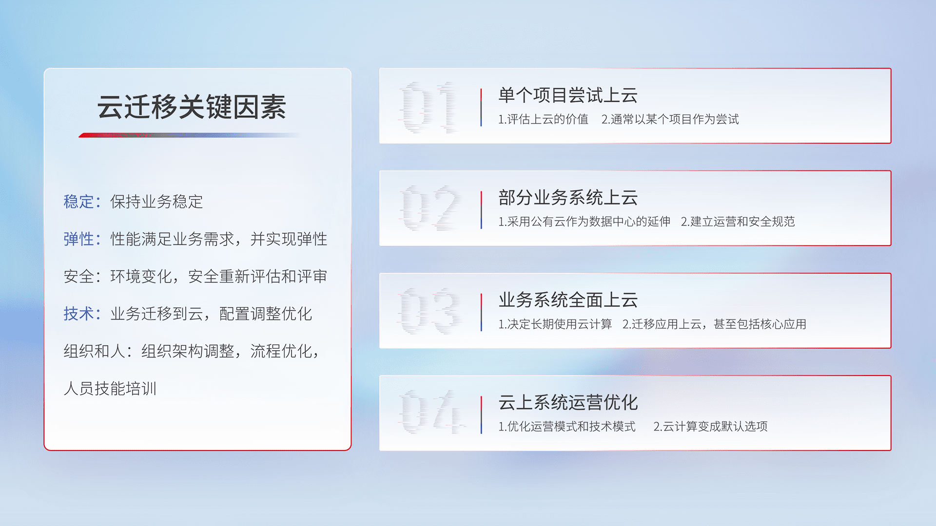 结合实际业务,,从规划设计、、、云平台选型、、、云原生改造、、、、数据迁移、、、集成交付,,迁移全过程为客户识别最佳上云路径,,做好风险识别管理,,设计网络架构、、、、身份权限、、、、安全审计合规、、、、操作审计、、日志审计、、监控告警策略、、、多站点容灾设计等,,,,对云上基础设施进行整体规划,,,,提升IT治理水平,,以满足弹性、、、高可用、、、、高性能的需求。。。。