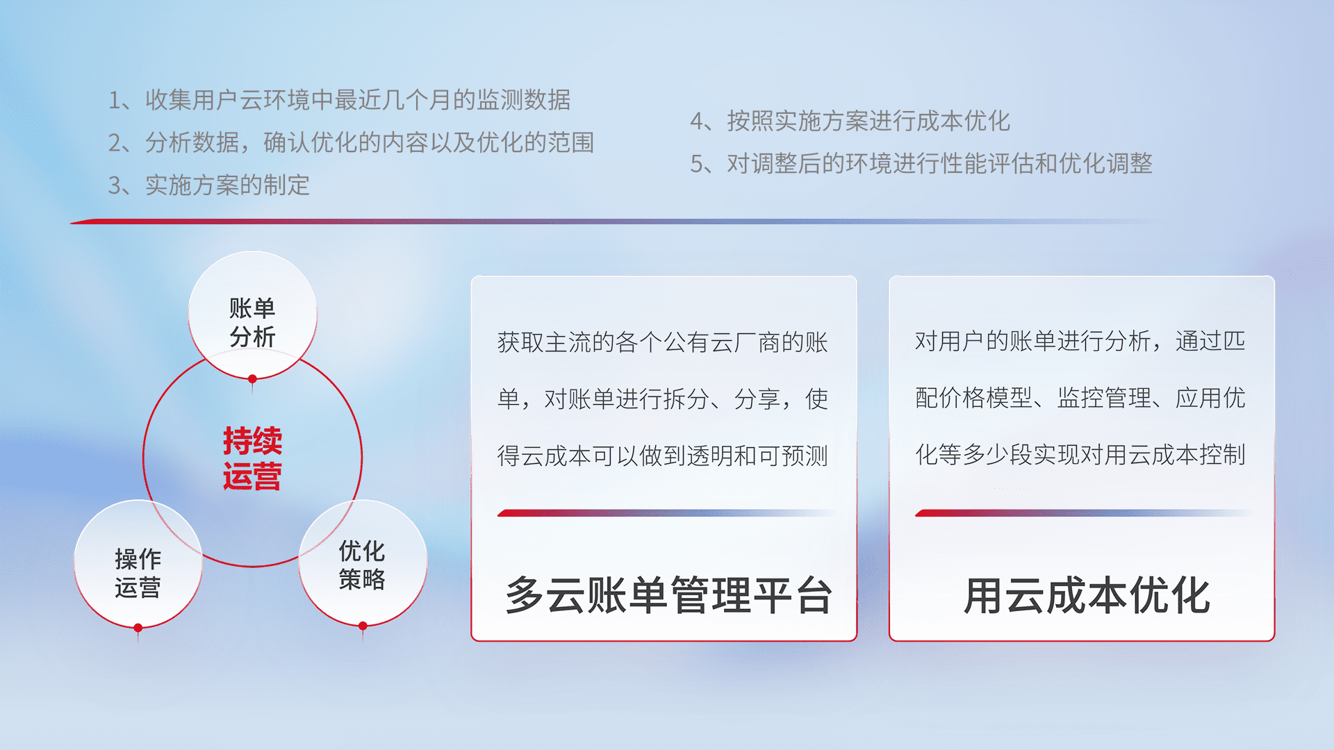 通过多云纳管,,,,以统一的资源数据模型把客户的云资源进行抽象和封装,,进而实现对多云资源的统一操作,,保障云资源管理的可靠性、、稳定性与可用性。。量身定制化运维内容,,,,配置、、、、开发运维、、补丁管理、、、、备份、、、监控、、、、认证和访问管理、、、审计和日常巡检等,,,,保障在用云过程中的可靠度,,,稳定度以及高可用率。。。。