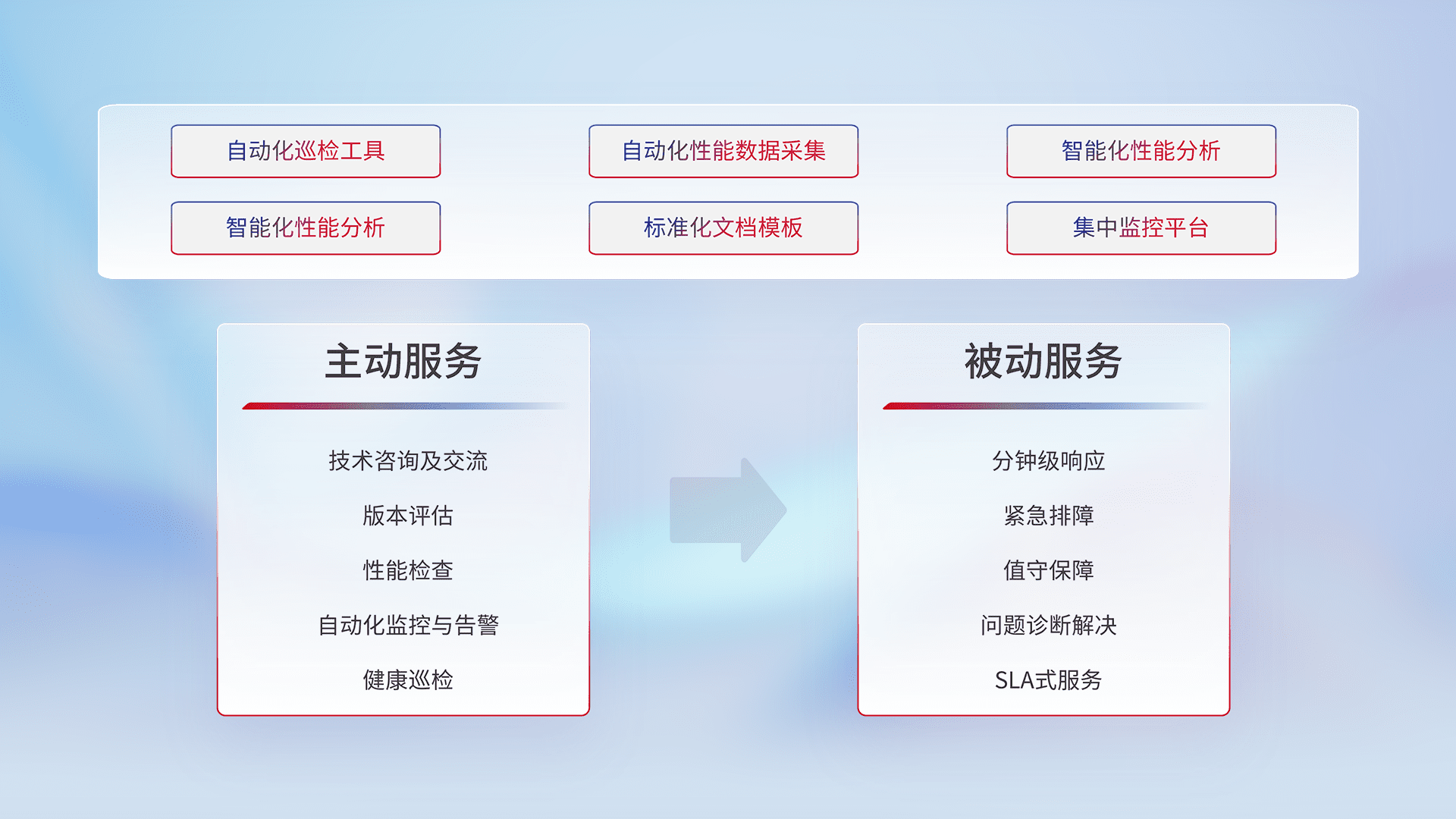 智能化工具和标准化文档,,,,保障服务质量,,,,提供主动服务(包含技术咨询、、、、版本评估、、性能检查、、自动化监控与告警、、健康巡检)和被动服务包含(分钟级响应、、、、紧急排障、、、值守保障、、、、问题诊断解决、、、SLA服务)。。