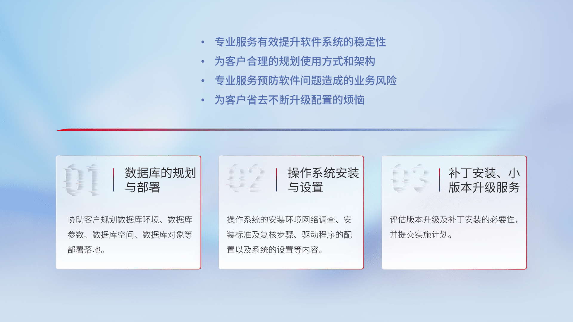 为客户提供软件规模升级、、、快速部署、、按需配置的专业服务,,,从数据库的规划与部署到操作系统的安装与设置,,,,再到补丁安装和小版本升级提供支持。。。