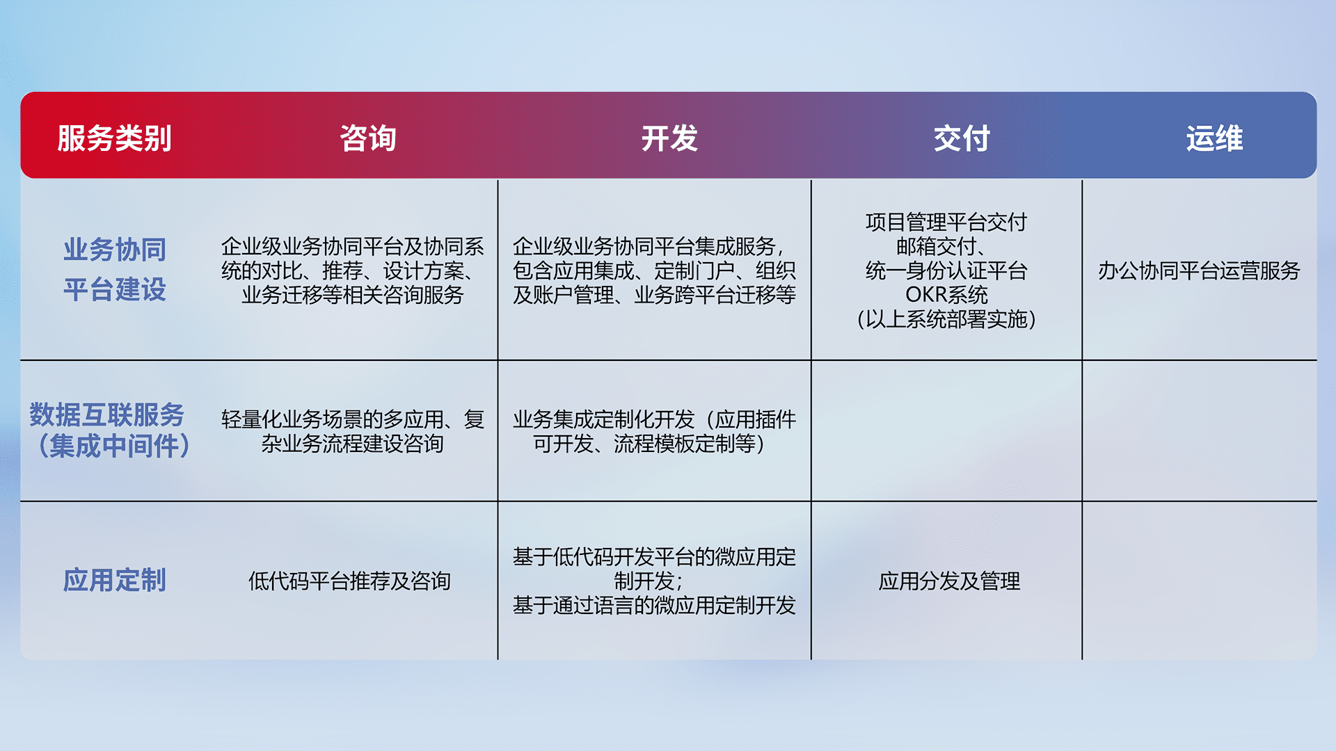 针对钉钉、、、企微、、、IDaas等平台级产品提供产品的规划、、方案、、交付、、定制化开发等服务,,实现如统一协同办公、、、、智能客户服务、、混合会议管理、、智能数据查询、、、等业务场景,,,实现数字化转型。。