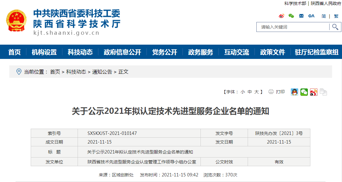 根据《陕西省技术先进型服务企业认定管理办法(试行)》(陕科产发﹝2017﹞220号)、、《关于在〈陕西省技术先进型服务企业认定管理办法(试行)〉中增补〈技术先进型服务业务领域范围(服务贸易类)〉的通知》(陕科办发﹝2018﹞118号)精神,,,,经企业申报、、、、地市审查推荐,,,省科技厅会同省财政厅、、、省税务局、、省商务厅、、、省发展改革委组织专家评审,,,现对拟认定技术先进型服务企业名单(详见附件)进行公示,,,,公示期为10个工作日。。。。